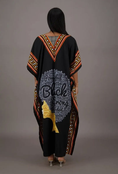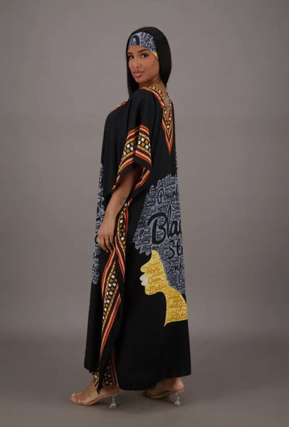 Celebrate African heritage with our Dashiki Border Print Kaftan. This kaftan features a stylish Dashiki border and a central block print of an African lady with an Afro. Made in India, it's complemented by short sleeves and a matching headwrap, making it versatile for any occasion.
